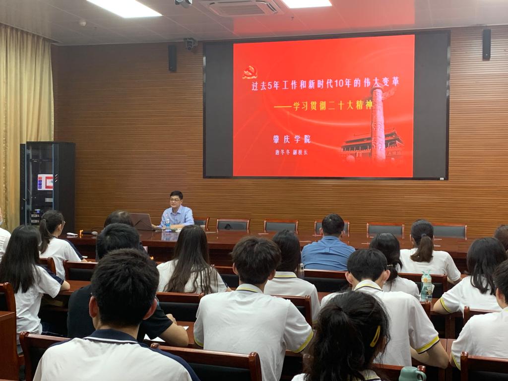 唐冬冬以《过去5年工作和新时代10年的伟大变革》为题,围绕党的十八大后党和国家事业所处的历史方位、党中央治国理政理念战略的深层次变革及新时代十年伟大变革的历史性成就和重大意义等三个方面深入浅出地分析讲解。他强调,新时代十年,以习近平同志为核心的党中央团结带领全党全军全国各族人民攻克了许多长期没有解决的难题,办成了许多事关长远的大事要事。实践证明,党确立习近平同志党中央的核心、全党的核心地位,确立习近平新时代中国特色社会主义思想的指导地位,是有力解决影响党长期执政、国家长治久安、人民幸福安康突出矛盾和问题的最大保证,也是党和国家事业发生历史性变革、取得历史性成就的根本原因。他勉励现场师生,“实现中国梦是一场历史接力赛。新时代的中国青年,生逢其时、重任在肩,广大青年要努力争当行业骨干、青年先锋,在新时代的征程中发挥光和热,在中华民族伟大复兴中贡献自己的力量。”