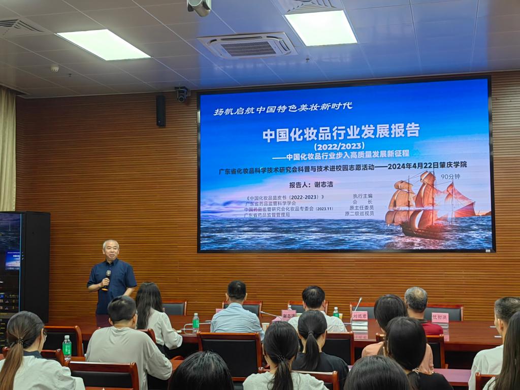 4月22日,广东省药品监管科学学会会长谢志洁、广东省化妆品科学技术研究会林芝秘书长一行莅临公司交流指导,谢志洁作了一场题为《中国化妆品行业发展报告(2022/2023)-中国化妆品行业步入高质量发展新征程》的精彩讲座。讲座由公司党委书记刘远君主持,化妆品方向的骨干教师、辅导员及化妆品专业员工近百人参加了本次讲座。