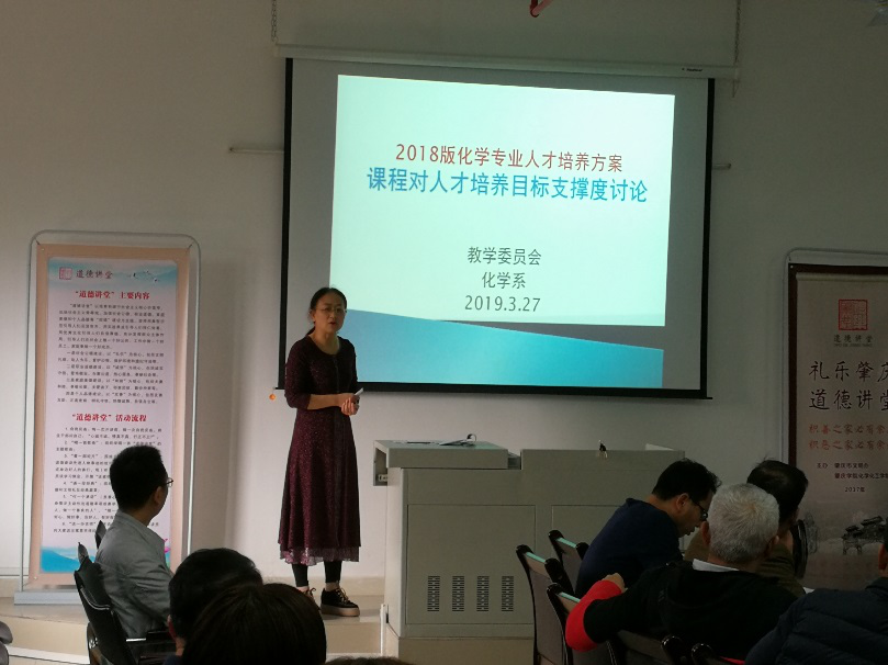 2019.3.27日吴燕妮教授和化学系教师在理工大楼218召开了“2018版化学专业人才培养方案课程对人才培养目标支撑度讨论”专题会,由公司教学委员会和化学系老师参加。会议中吴燕妮老师介绍了毕业要求的分指标点、课程目标如何支撑毕业指标,以及毕业要求分指标点与课程支持关系确定的重要性和意义,并组织老师开展自己课程的对标工作。