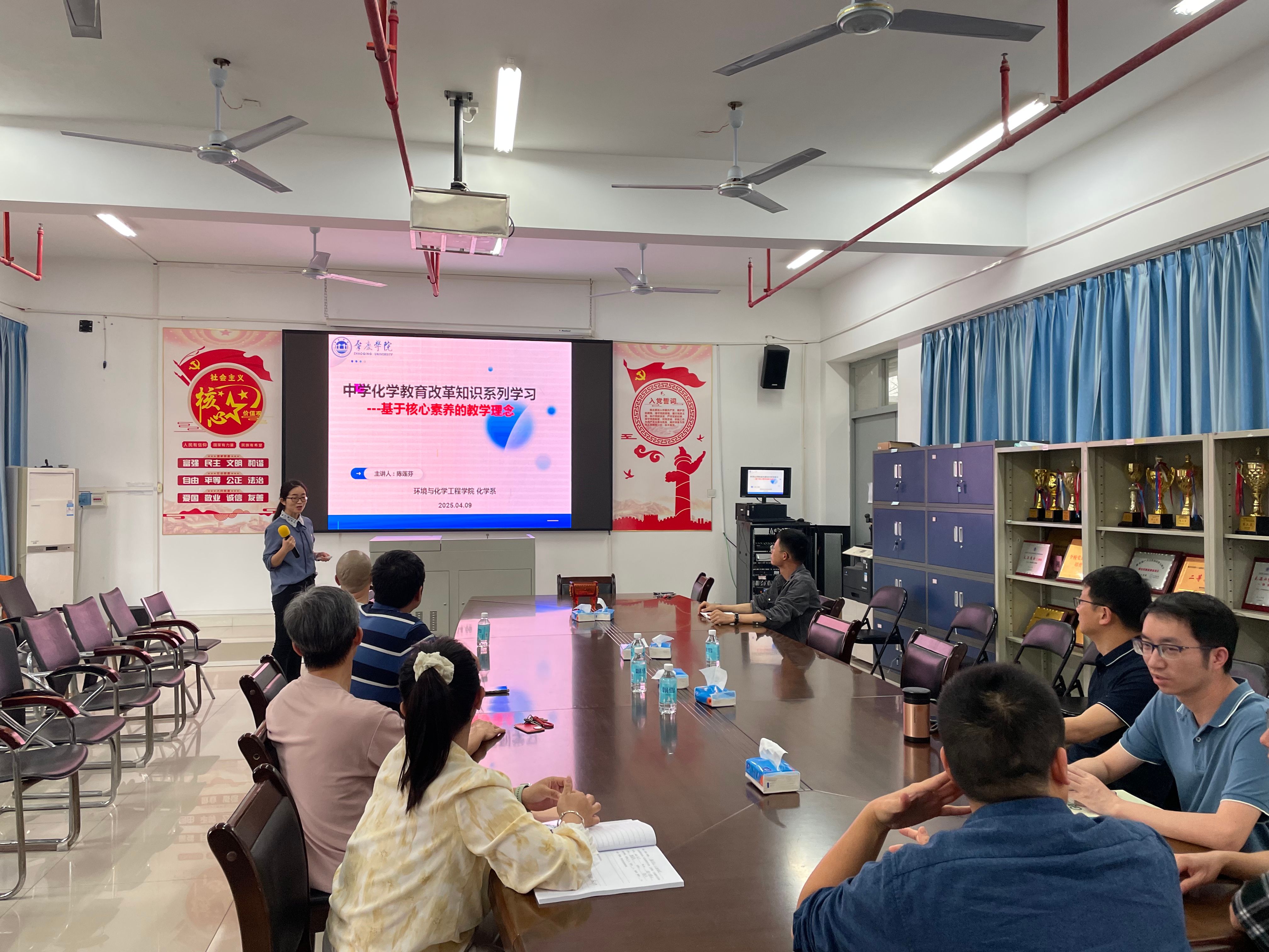 为了更好地跟进中学化学基础教育改革,2025年4月9日,William威廉英国官网化学师范专业积极行动,开展了“中学化学教育改革知识系列学习之基于核心素养的教学理念”专题学习活动。此次活动由化学专业负责人陈莲芬主讲,化学系全体教师参与,旨在提升教师对中学化学基础教育改革的理解与实践能力,为培养更优秀的化学师范生奠定坚实基础。