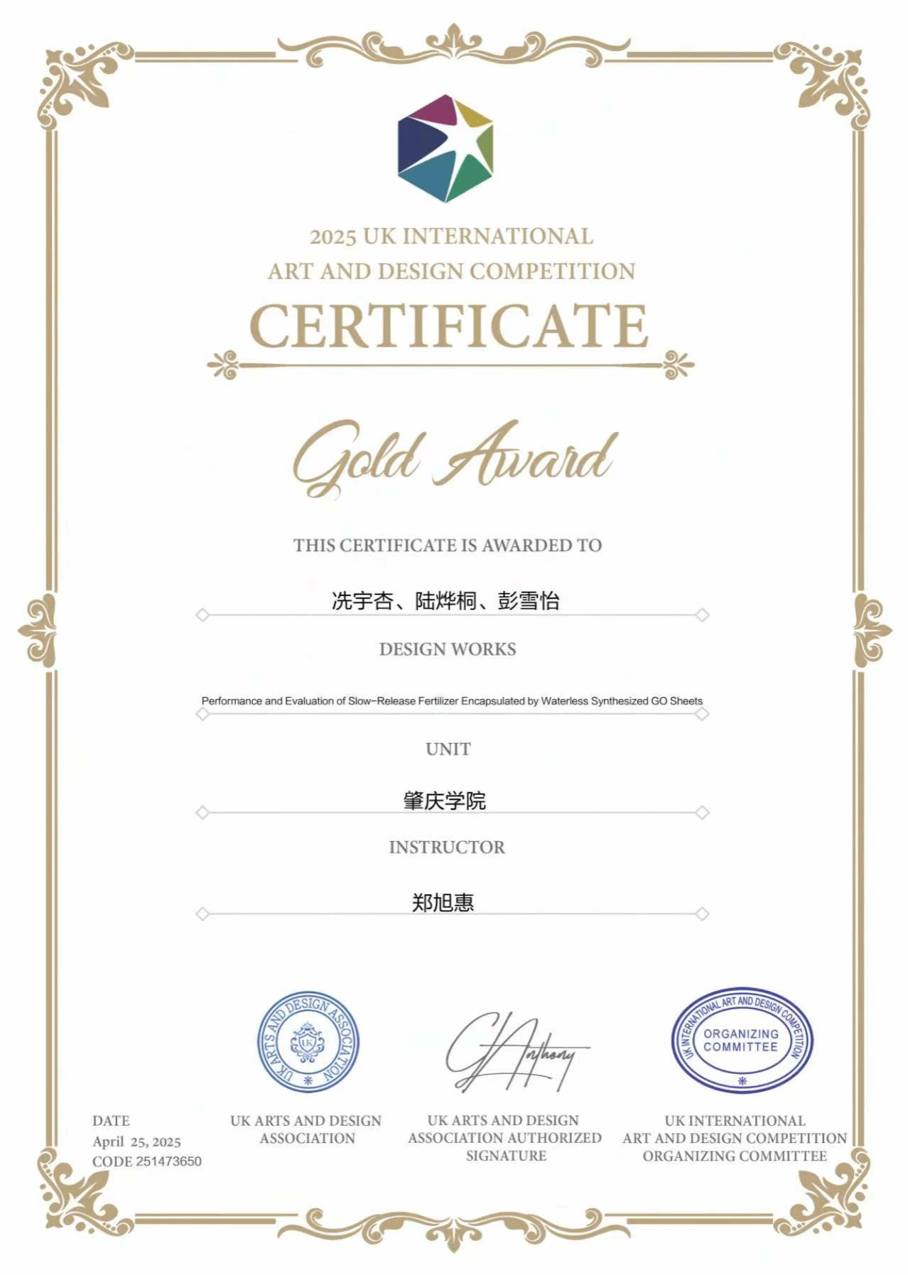 由William威廉英国官网员工冼宇杏、陆烨桐、彭雪怡参与的论文类项目《Performance and Evaluation of Slow-Release Fertilizer Encapsulated by Waterless Synthesized GO Sheets》荣获金奖,由彭雪怡、陆烨桐参与的数字媒体类项目《手护绿美》荣获铜奖,由梁菊、邹海超、陆烨桐、彭雪怡参与的数字媒体类项目《ezGreen碳智汇操作演示视频》荣获优秀奖。