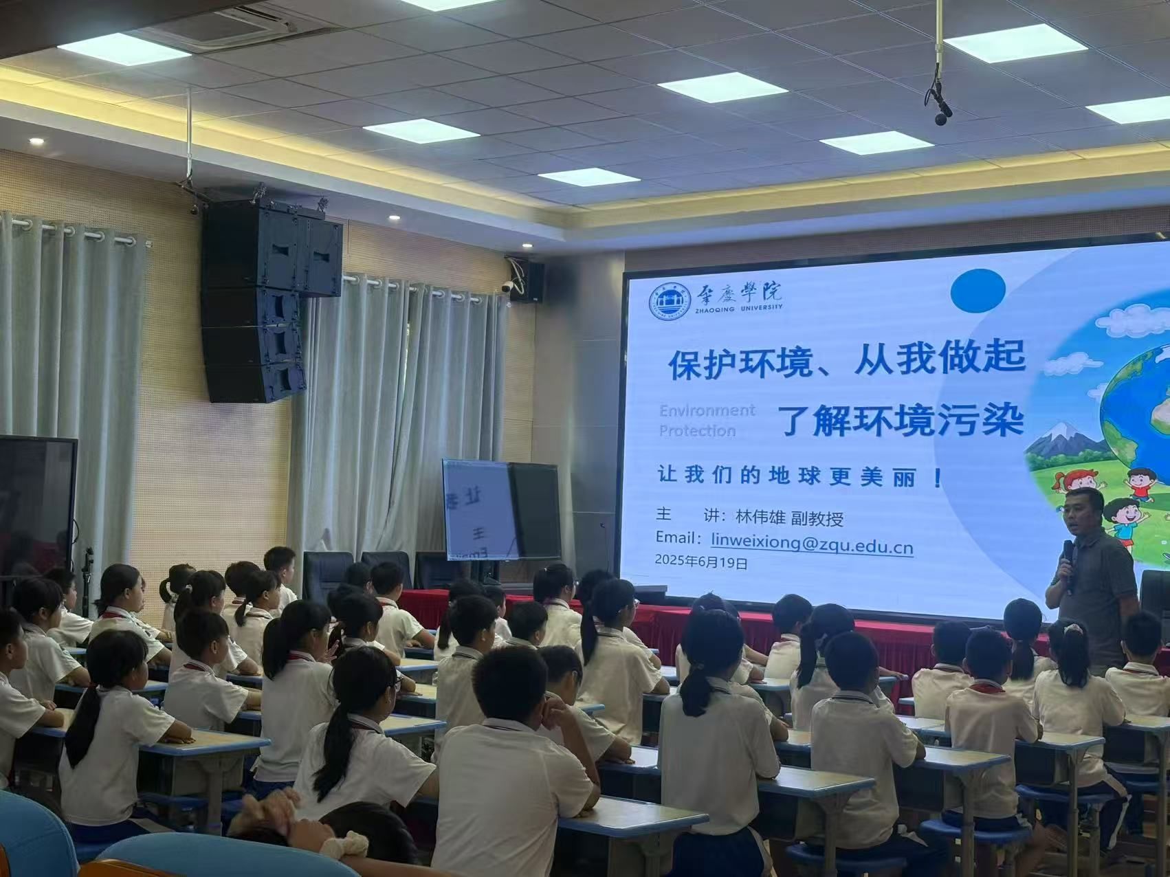 活动中,林伟雄以“保护环境,从我做起”为主题,为四年级同学带来了一场生动的环保知识讲座。他通过浅显易懂的语言,详细介绍了环境污染的概念、分类及危害,让同学们深刻认识到环境保护的重要性。为增强同学们对环保知识的直观理解,林伟雄还现场演示了污染物的处理实验,有趣的实验现象引发了同学们的阵阵惊叹与好奇。