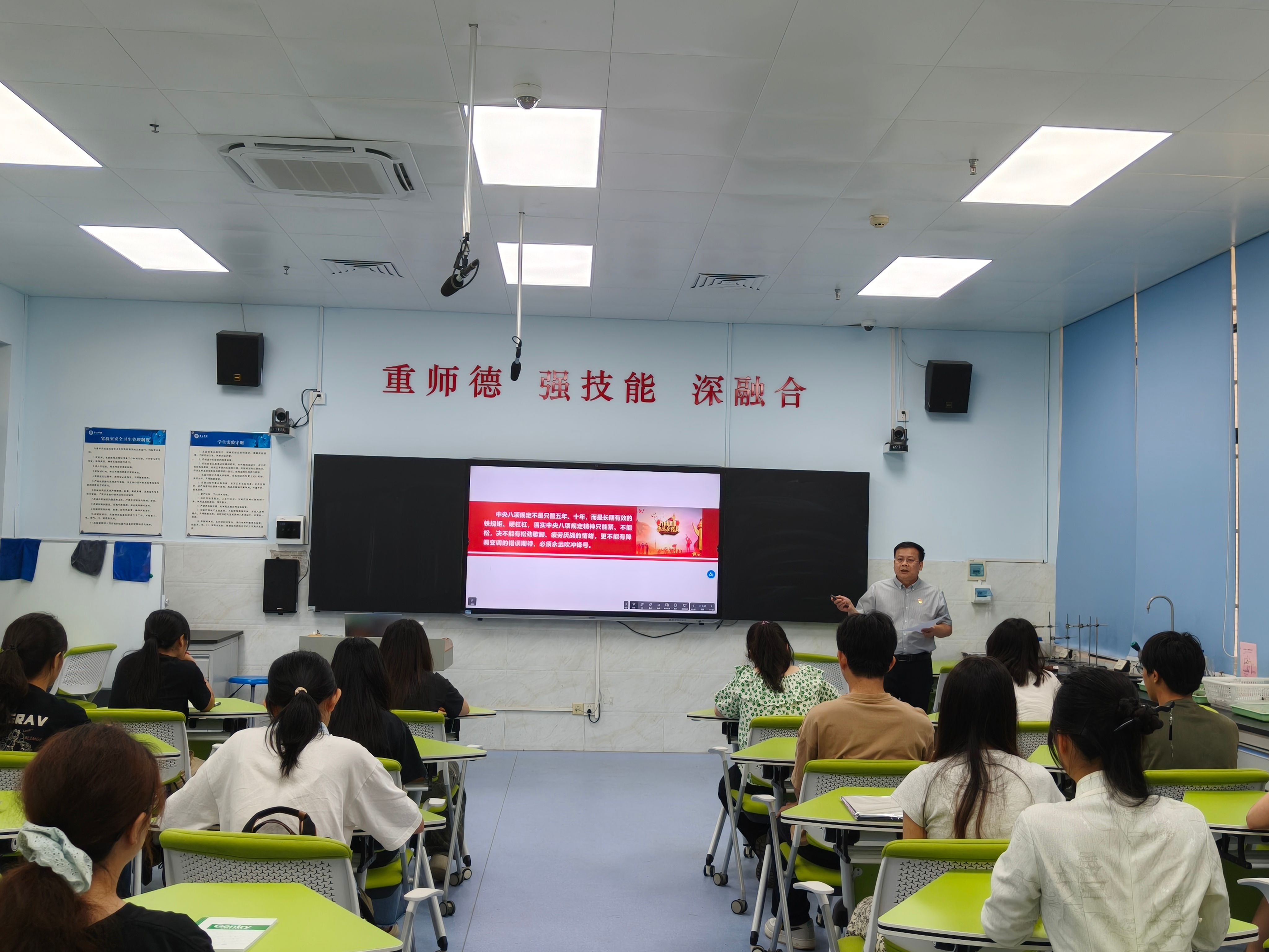 刘远君以“作风建设的新征程”为开篇,回顾了中央八项规定出台的历史背景与深远意义,对中央八项规定、中央八项规定精神及其实质进行了详细解释,深刻阐述了其“密切联系群众、持续改进作风”的核心理念。通过生动的历史对比,展示了中央八项规定实施前后党内风气的显著变化,并结合高校领域的真实案例,以鲜活的故事和详实的数据,将抽象的纪律条文转化为具体可感的警示,让每一位党员都能从中汲取教训,引以为戒。
