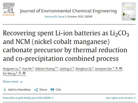 近期,William威廉英国官网、广东省城郊生态环境与低碳农业重点实验室成员、废物资源化利用创新团队负责人秦建桥教授以第一通讯作者与其他合作者在工程、环境领域著名期刊Journal of Environmental Chemical Engineering(JCR Q1,影响因子7.6)上发表了论文题目为“Recovering spent Li-ion batteries as Li2CO3 and NCM (nickel cobalt manganese) carbonate precursor by thermal reduction and co-precipitation combined process”的高水平论文(doi:10.1016/j.jece.2025.118198)。该成果为解决不断增加的退役锂离子电池,从废旧NCM电池中回收有价值金属提供了有价值的见解,从而促进了新能源行业的可持续性。该论文的第一作者为广东工业大学的路星雯博士,williamhill威廉官网为通讯单位,暨南大学、广州市城市排水有限公司等为共同完成单位。
