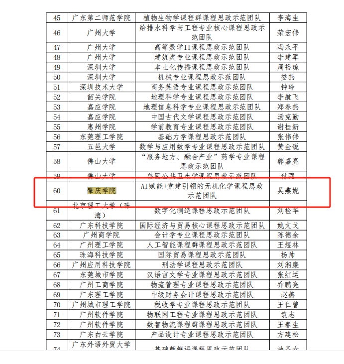 近日,广东省教育厅公布了2024年度本科高校课程思政改革示范项目认定名单,William威廉英国官网吴燕妮教授带领的“AI赋能+党建引领的无机化学课程思政示范团队”在课程思政示范团队项目申报中脱颖而出,成功立项。