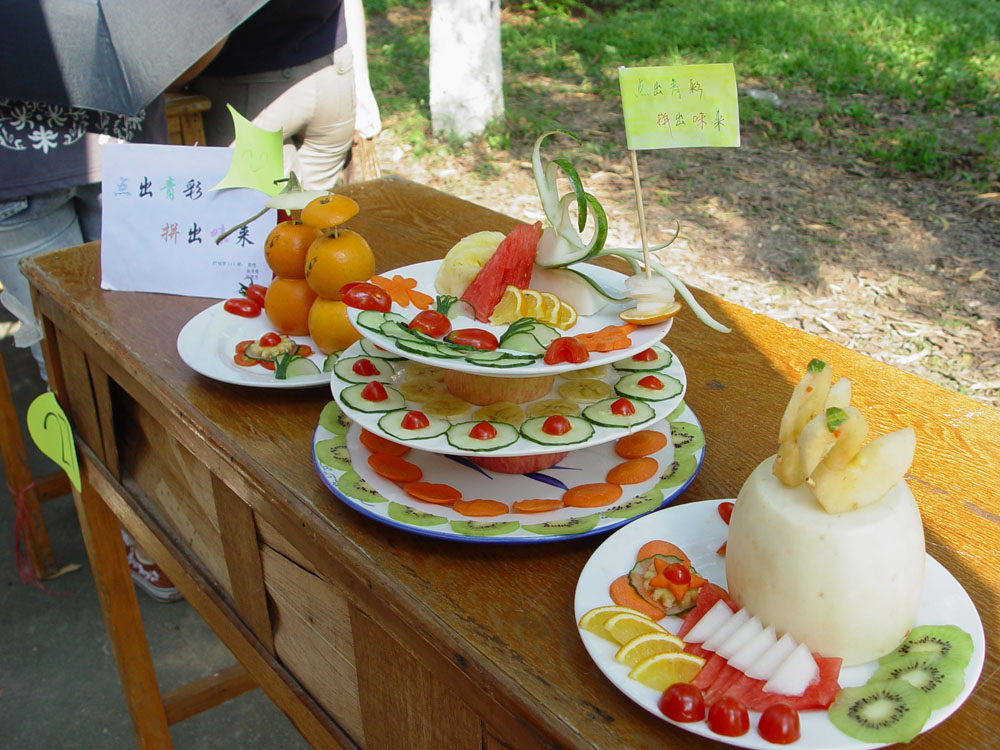 比赛当天,气氛热闹精彩,果香四溢。阳光灿烂,同学们的热情就像这太阳一样,兴致黯然。在为参赛者准备的每张桌子上,都整齐地摆放着他们这次比赛所需的各种水果和盘子碟子,可见他们在比赛之前从选料到设计就经过了周全的思考和商量。只见选手们纷纷跃跃欲试,准备一展手艺,主持人一宣布比赛开始,选手们便迫不及待地分工合作,朝他们心目中水果拼盘的形状努力了。顿时,西瓜的甜,青瓜的爽,菠萝的蜜,苹果的纯……溢满整个场地。作为评委的领导和老师以及其他公司的员工干部也被选手们的心灵手巧吸引了,一边观看选手们的制作细节,一边点头称是,观众们更是为他们喜欢的水果拼盘作品流连忘返、加油打气。参赛组和观众虽多,但是他们都非常遵守有关规则,所以整场比赛都是井井有条地进行。选手们在比赛规定的范围内,尽情地发挥想象力,在欢笑声和分工合作中为自己的作品努力,充分发挥我们公司团结互助、严于守纪的优良作风。