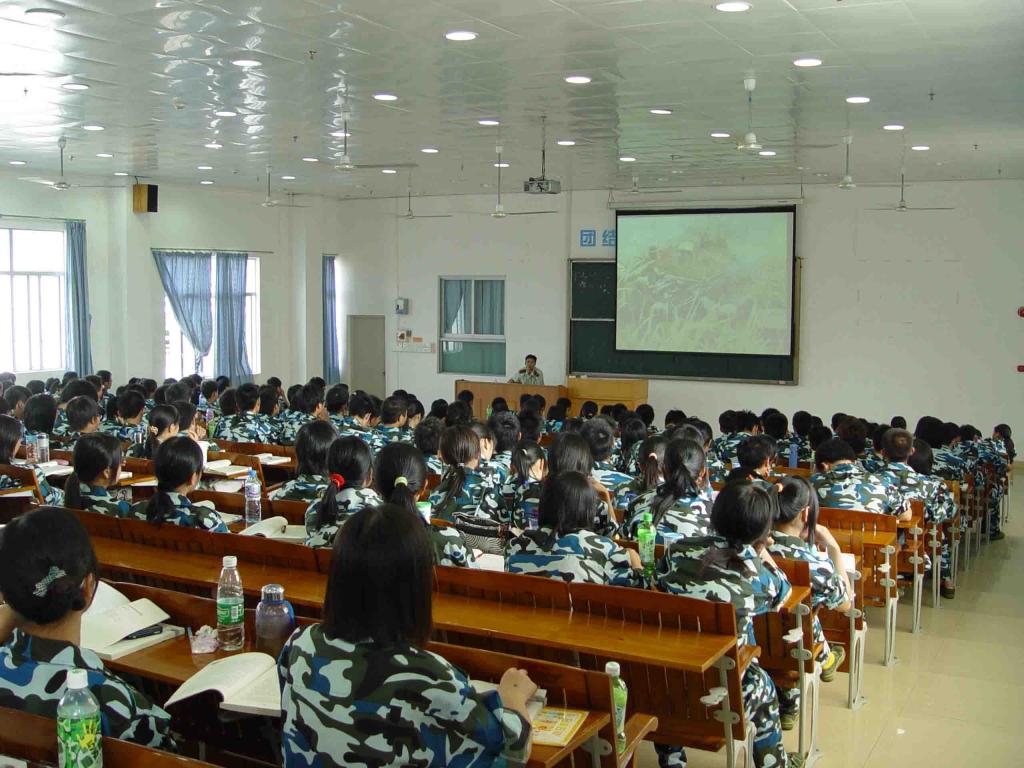 除了在室外的实践操练,军事理论课也是新生军训的重要环节,公司新生的军事理论课于9月12日在9号教学大楼707开课。707教室的位置比较高,空气不流通加上高温闷热的气候,在这里上课不比在室外操练轻松,但是新生们没有输给恶劣的条件,仍然坚持认真听课。教学经验丰富的教官非常耐心地向新生们讲述中国国防、军事思想、世界军事、军事高技术、高技术战争等军事知识,使他们受到了爱国思想的熏陶,扩大了视野,相信新生们定必受益匪浅。