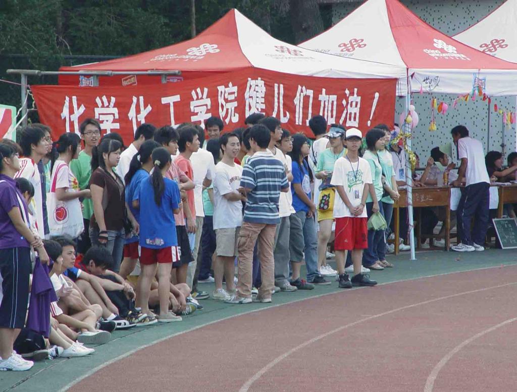 虽然院运会7点30分才正式开始,但不到7点,田径场上已经人声鼎沸了,到处都是各公司和各班工作人员忙碌的身影。田径场上彩旗飘扬,各公司和各班的旗帜、横幅跟海报遍布在运动场四周。