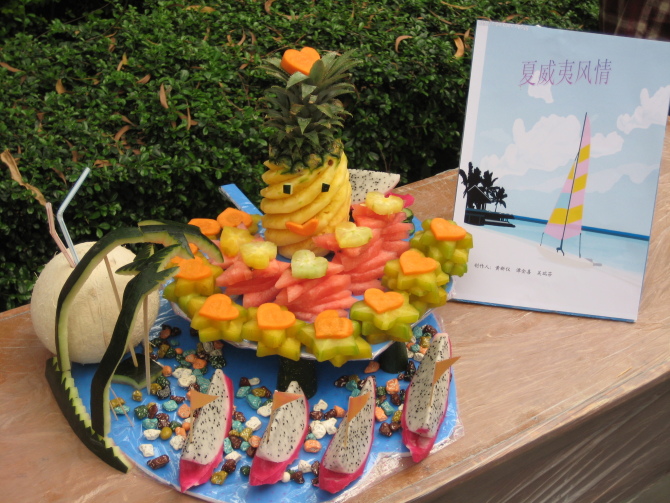 在比赛开始之前,参赛选手带着各种各样的水果来到了参赛的现场,他们信心十足,胜券在握。紧接着,一个小时的水果拼盘大赛开始了,各组参赛选手紧密合作、专心致志雕刻手中的水果,赋予它们生命的活力。在创作的过程中,赞叹声、相机声不断。很快,精巧玲珑的作品在参赛者手中诞生。随后,评委走到各份作品面前进行综合品分。其中,“心心相印”所表达的中国心,精致的“黄金书屋”, 浪漫的“鸳鸯戏水”, 美好祝愿的“平安鹅”,赢得了众多观众的欢心。