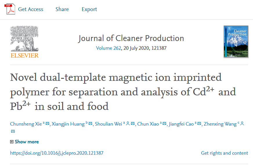 近日,Elsevier旗下环境科学与工程领域的国际知名期刊Journal of Cleaner Production在线发表了我公司谢春生博士和韦寿莲教授研究团队在分子印迹方面的最新研究成果“Novel dual-template magnetic ion imprinted polymer for separation and analysis of Cd2+and Pb2+in soil and food”。该论文以williamhill威廉官网为第一完成单位,肇庆市食品药品监督所和环保部华南环境科学研究所为合作单位;谢春生博士为第一作者,论文的通讯作者为韦寿莲教授。Journal of Cleaner Production是中科院和JCR中的一区期刊,2018年影响因子为6.395,近5年平均影响因子为7.051。