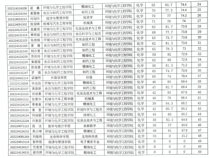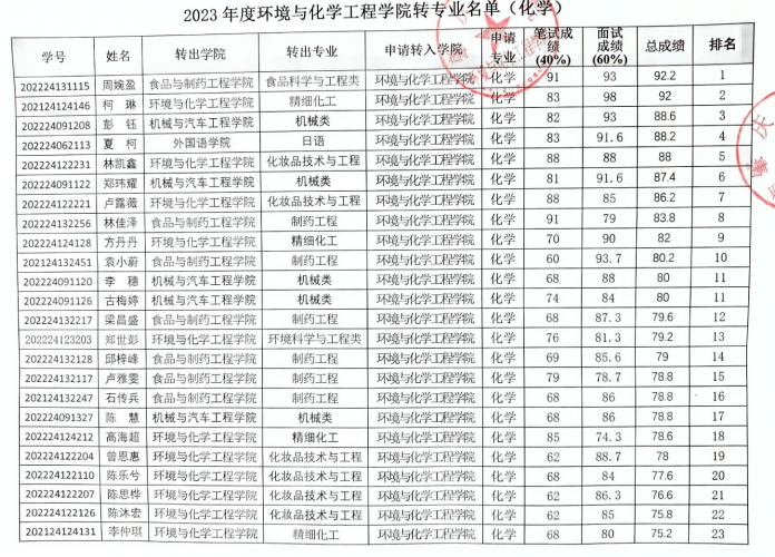 根据《williamhill威廉官网全日制本科员工转专业管理规定》及《2023年环境与化学工程公司转化学专业工作通知》,经过各专业转专业笔试和面试,所有参加转专业员工的转专业成绩公示如下:
