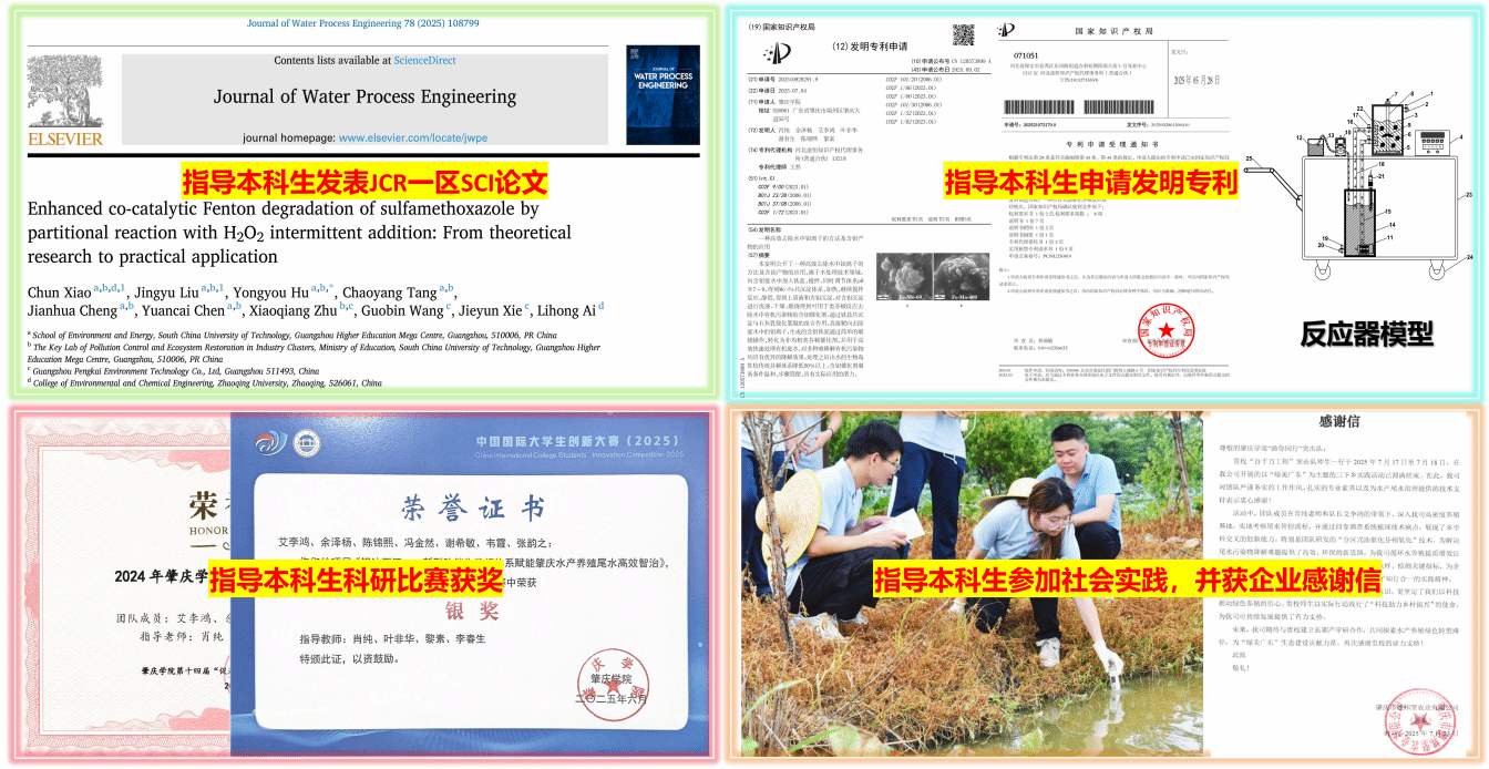 自2024年9月以来,肖纯老师指导2023级环境工程专业艾李鸿等员工荣获国家级、校级老员工创新创业训练计划项目、广东省科技创新战略专项资金(原“攀登计划”)项目立项;在williamhill威廉官网老员工节能减排工业设计竞赛、中国国际老员工创新大赛williamhill威廉官网初赛等多项赛事中屡获佳绩;在《Journal of Water Process Engineering》、《环境科学学报》、《中国给水排水》等高水平期刊发表多篇学术论文。同时,申请了“一种分区式助催化芬顿反应器”等多项国家专利,为技术应用奠定了坚实基础。