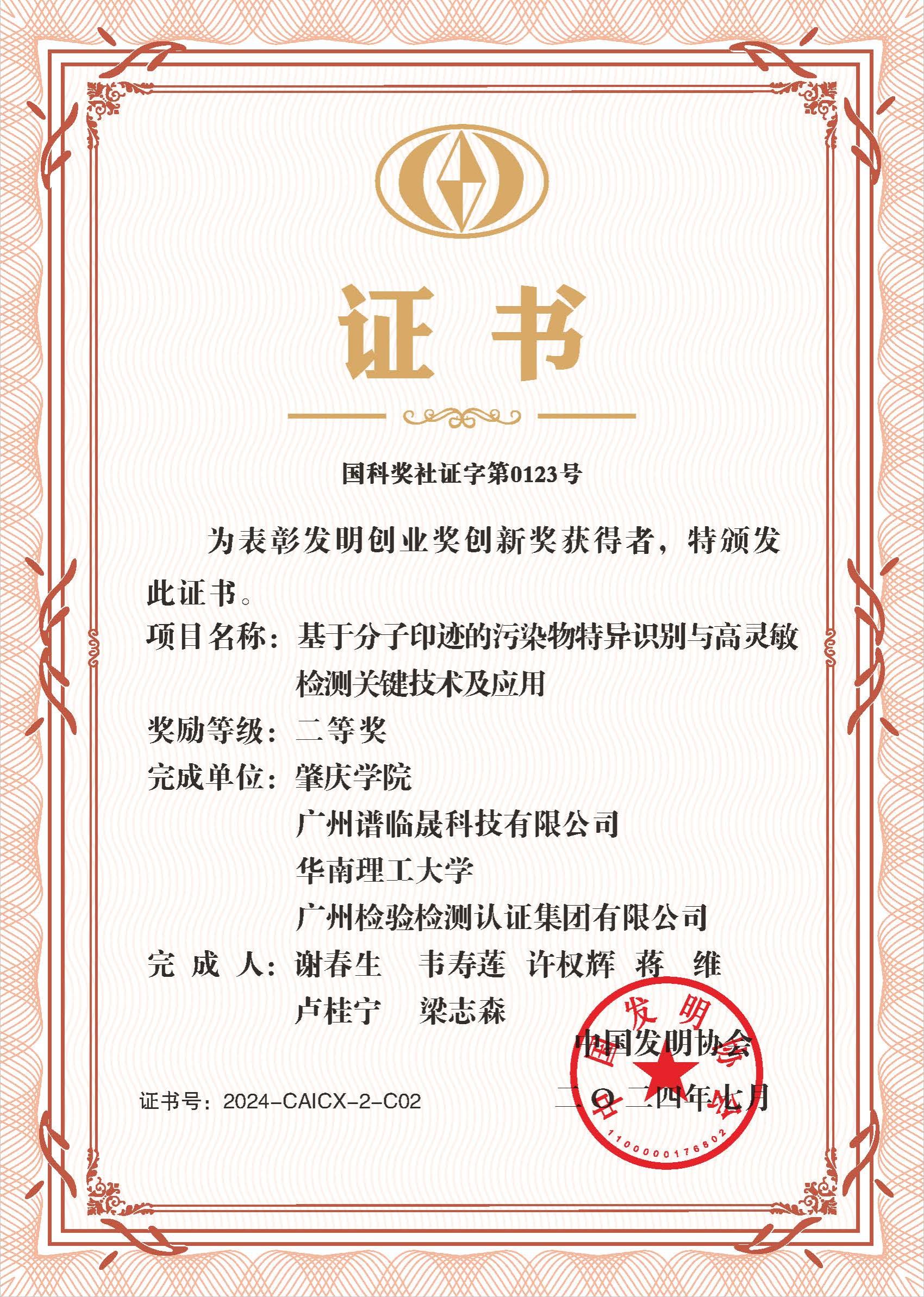 近日,中国发明协会颁发了2024年度发明创业奖证书,williamhill威廉官网作为第一完成单位、谢春生教授作为第一完成人的“基于分子印迹的污染物特异识别与高灵敏检测关键技术及应用”成果获得发明创业奖创新奖二等奖!