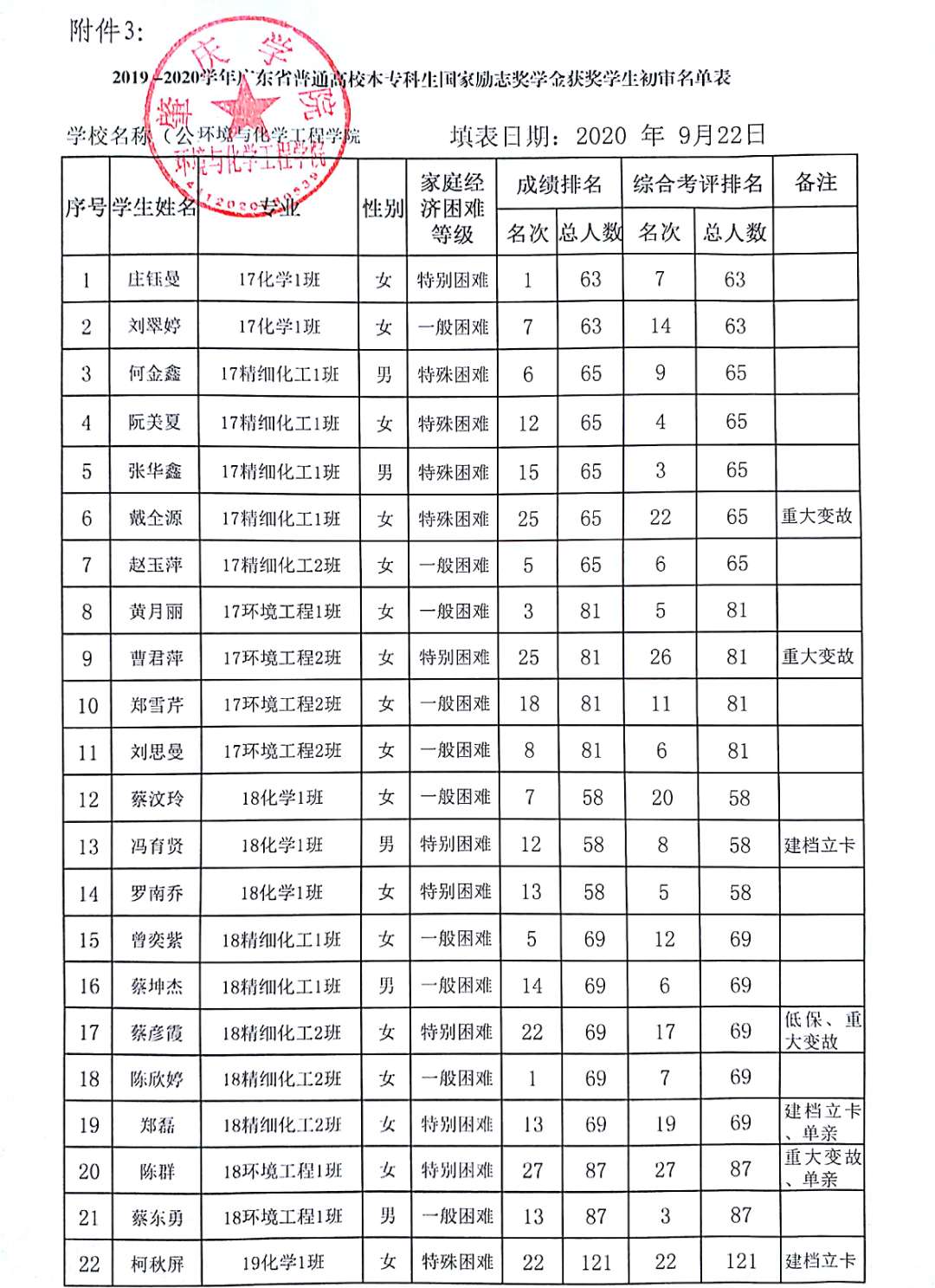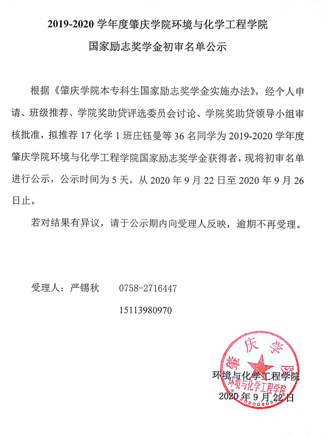 根据《williamhill威廉官网本专科生国家励志奖学金实施办法》,经个人申请、班级推荐、公司奖助贷评选委员会讨论、公司奖助贷领导小组审核批准,拟推荐17化学1班庄钰曼等36名同学为2019-2020学年度williamhill威廉官网环境与化学工程公司国家励志奖学金获得者,现将初审名单进行公示,公示时间为5天,从2020年9月22日至2020年9月26日止。